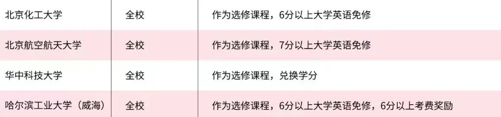 比如北京化工大学和哈尔滨工业大学,雅思6分以上就可免修大学英语;北京师范大学、重庆电子科技大学,可用雅思成绩等同4/6级。
