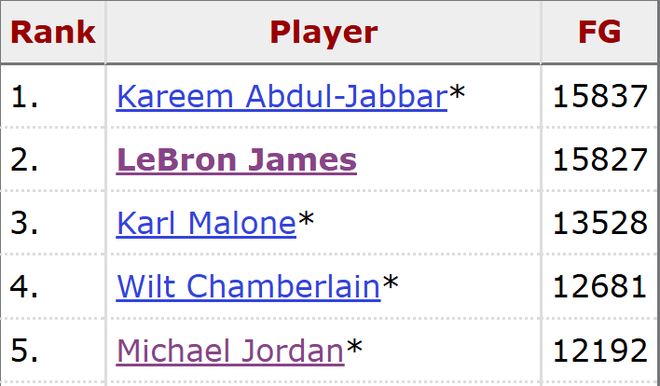 常规赛生涯至今,詹姆斯已经命中15827个球,排名历史第二,而排名第一的贾巴尔累计命中15837球,换言之,詹姆斯再进11个球就将超越天勾,成为该项数据的NBA历史第一。