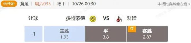 数据方面初始给到主让1.25的数据支撑,后市升到了主让1.5的数据支撑。外界给予多特极大的支持,完全无视近期的他们赛事密集,周中刚跑到丹麦去踢欧冠。感觉这对他们还是会有影响的,而且科隆本赛季开局还算稳定,这个客场起码是不会大败的局面。
